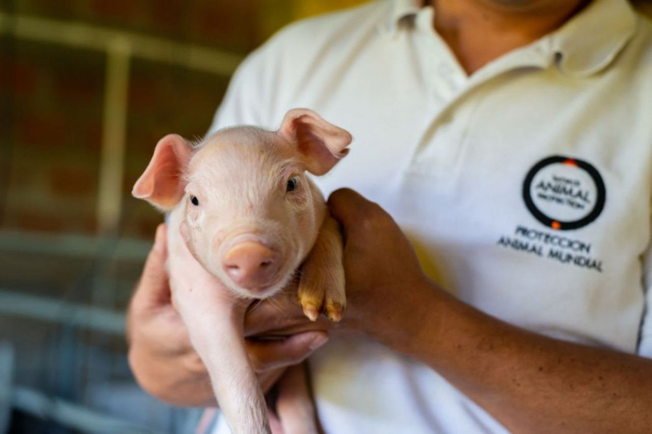 World Animal Protection staff member holding a piglet on a factory farm