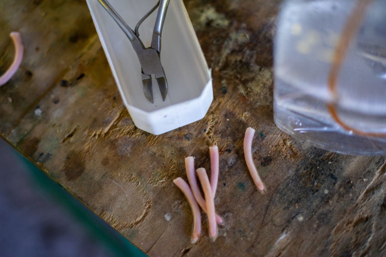 Cut off piglet tails on a table next to pliers